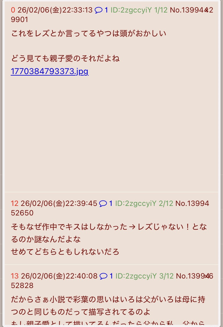 | … | 4926/02/08(日)13:52:01No.1399984686+レズだけでも家族愛だけでも括っちゃダメだよ |