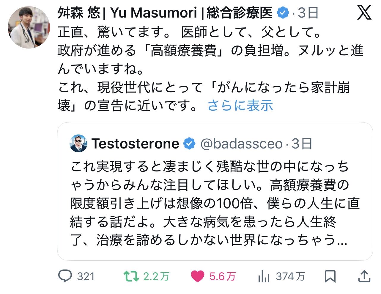 | … | 3926/02/08(日)14:35:00No.1399997315+>限度額越えたら全部一緒で患者も医者も算盤勘定やめるから野放図に高い薬作るし使っちゃう |
