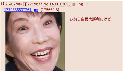 | … | 3526/02/08(日)22:21:42No.1400163565そうだねx1>お前ら自民大勝利だけど |
