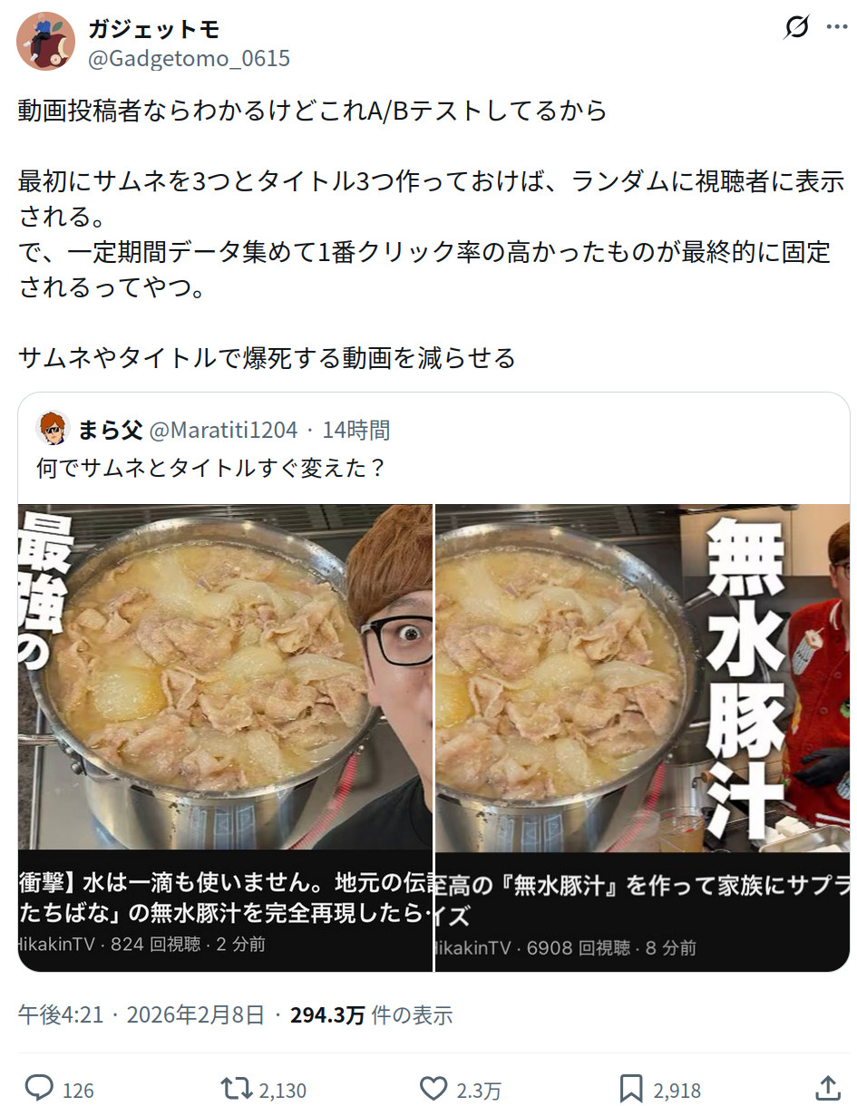 | … | 1226/02/09(月)03:41:55No.1400237507そうだねx2これ同じ動画でタイトル変えるとABテストにならなくない? |