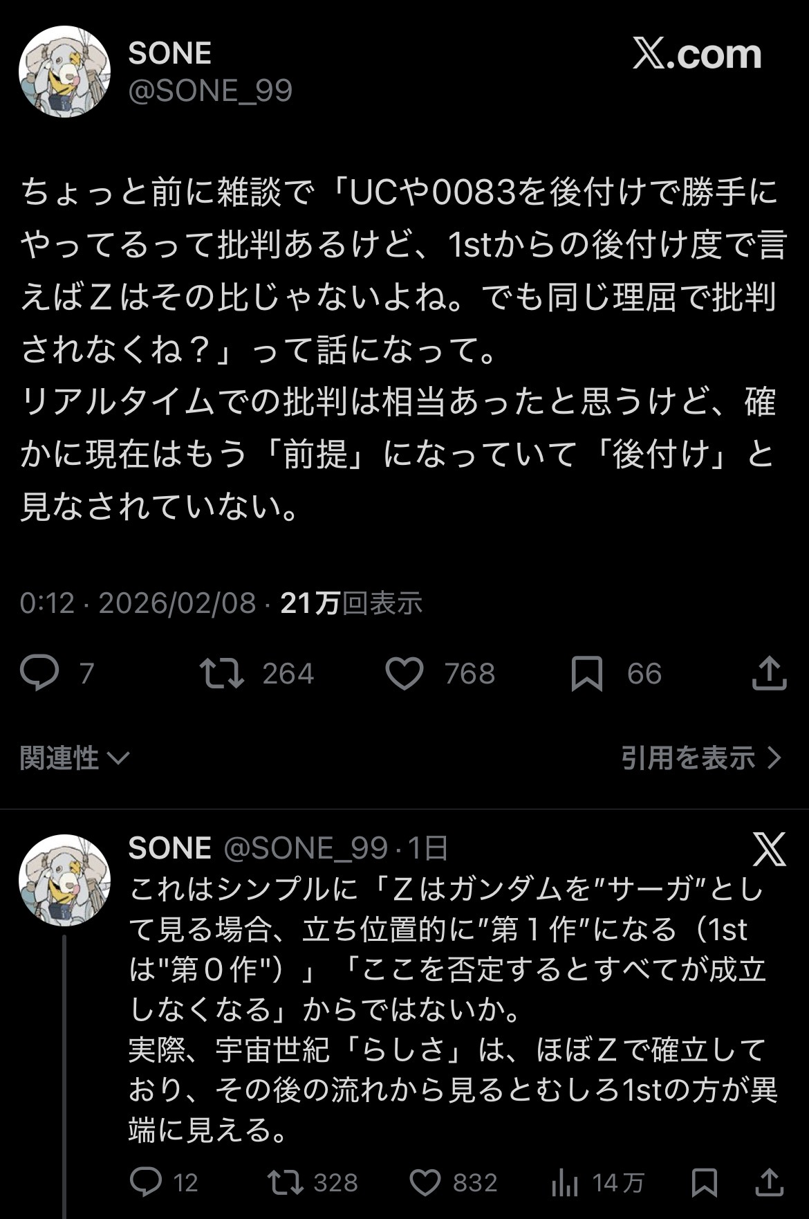 | … | 8526/02/09(月)10:00:07No.1400264981+そもそもアニメ化された時点で正史って視点から見るとUCも続編だろ |