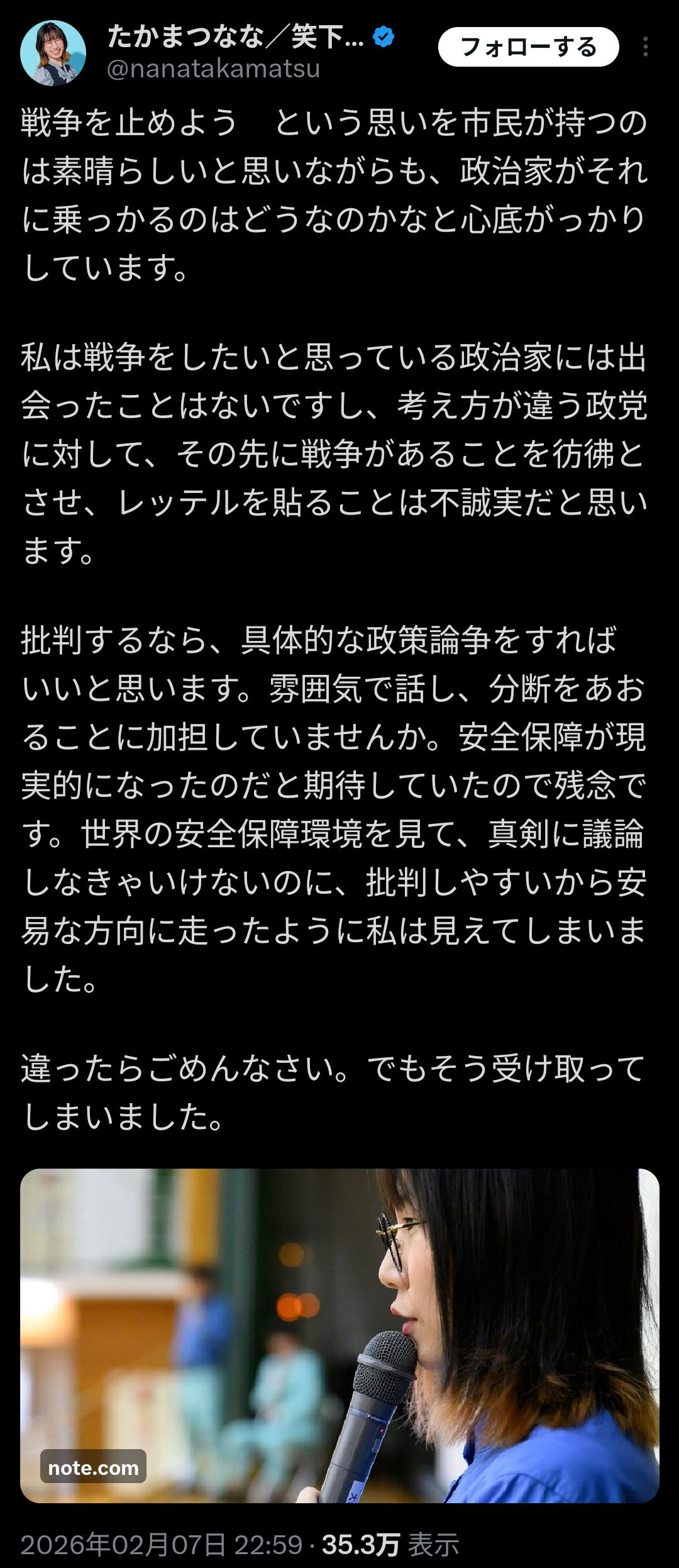 | … | 6526/02/09(月)09:49:24No.1400263020そうだねx7野党支持者が「サナエ自民は侵略戦争を再開する!」みたいな妄想でしかアジテーション出来なかったの |