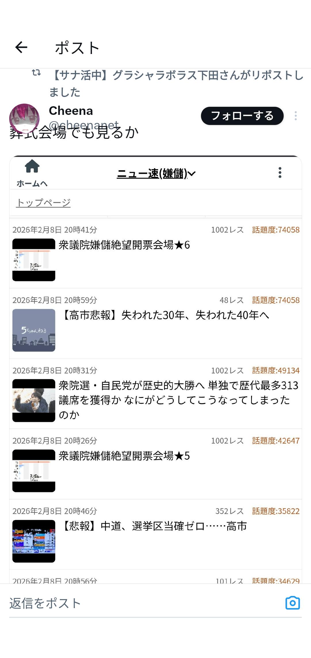 | … | 3726/02/09(月)09:44:01No.1400262015そうだねx2自民党の勝因春菜 |