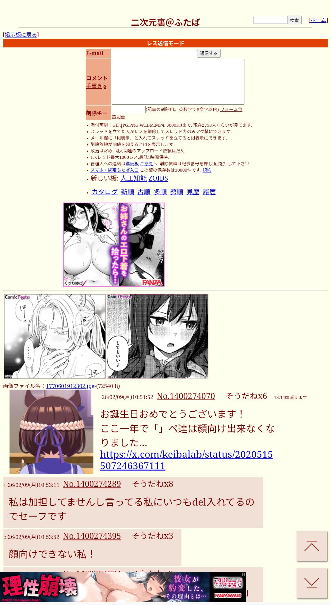 | … | 37026/02/09(月)12:48:57No.1400300150+私はアプリから書き込んでるのでエロ広告とは無縁です! |