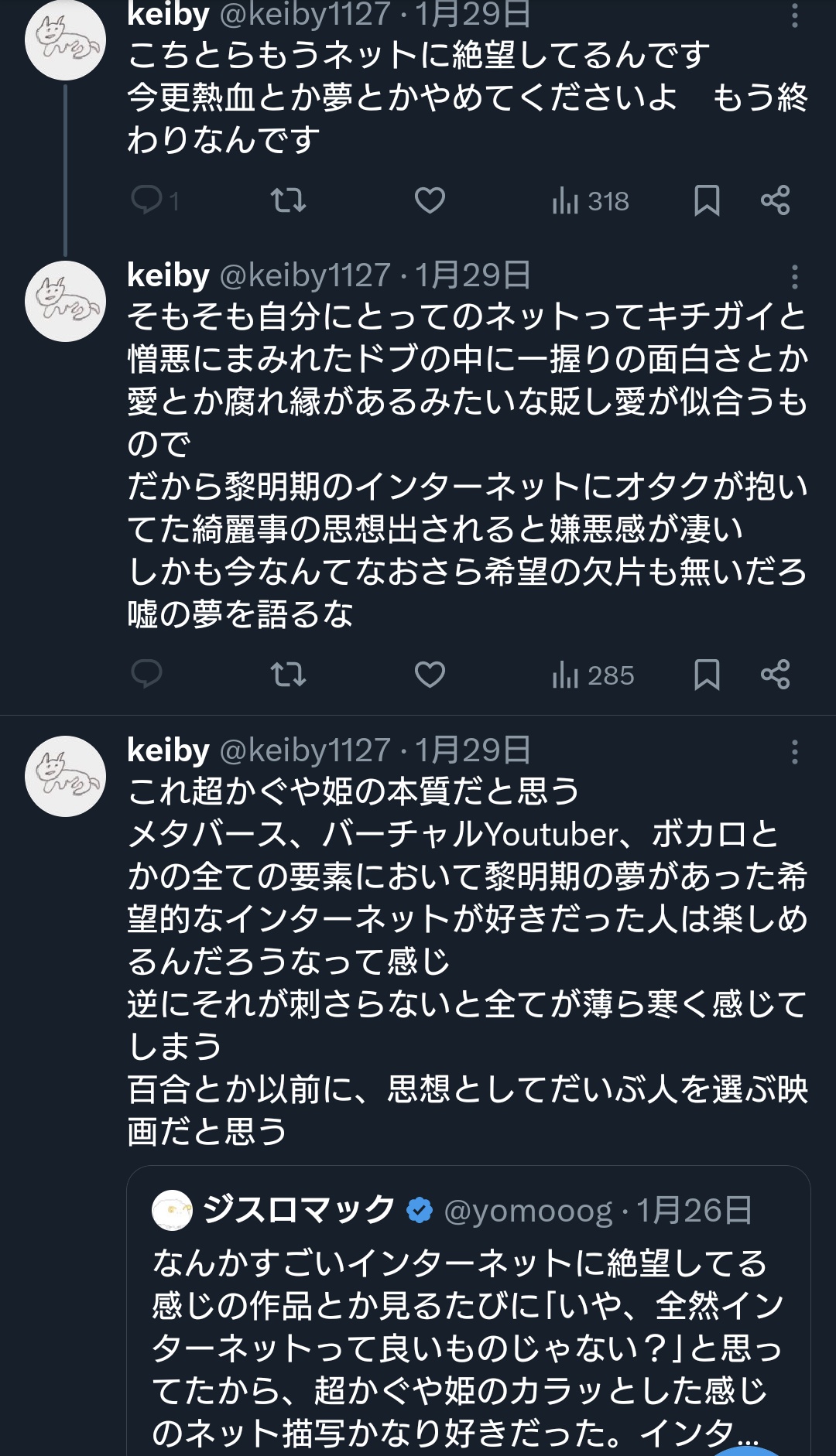 | … | 4026/02/10(火)02:36:16No.1400522421+インターネットに絶望してる感じの作品ってどんなの? |
