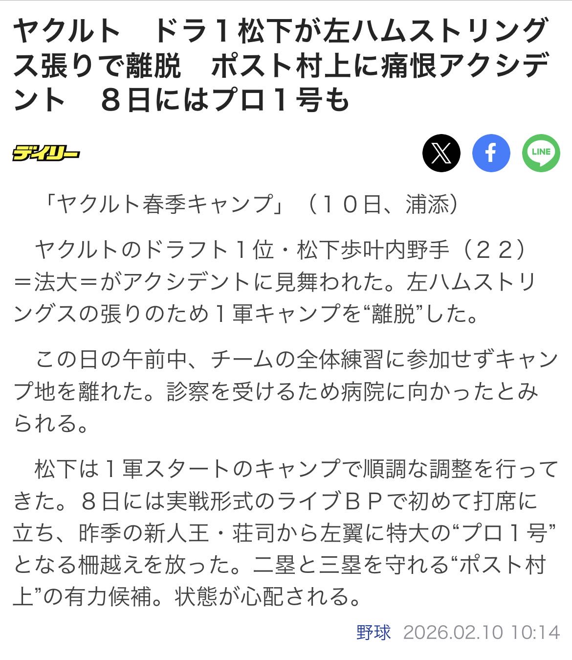 | … | 9026/02/10(火)10:20:50 ID:cBTOJajsNo.1400561583+ヤクルト ドラ1松下が左ハムストリングス張りで離脱 ポスト村上に痛恨アクシデント 8日にはプロ1号も |