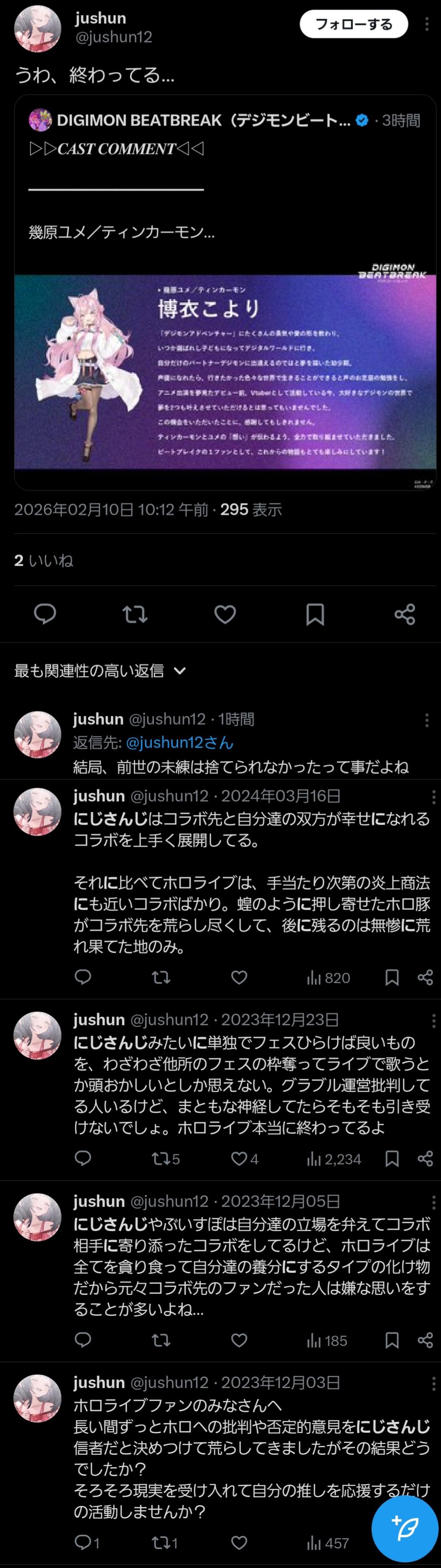 | … | 6126/02/10(火)17:30:48No.1400654372+>荒らしとかアンチじゃなくて割とヤクザと同類の集団なのでは… |