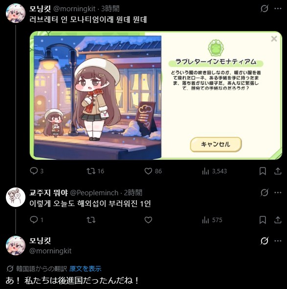 | … | 3226/02/11(水)09:01:31 ID:jzCM7fK.No.1400850846+先進国の言語センスは毎度のことながら本当に恐ろしい! |