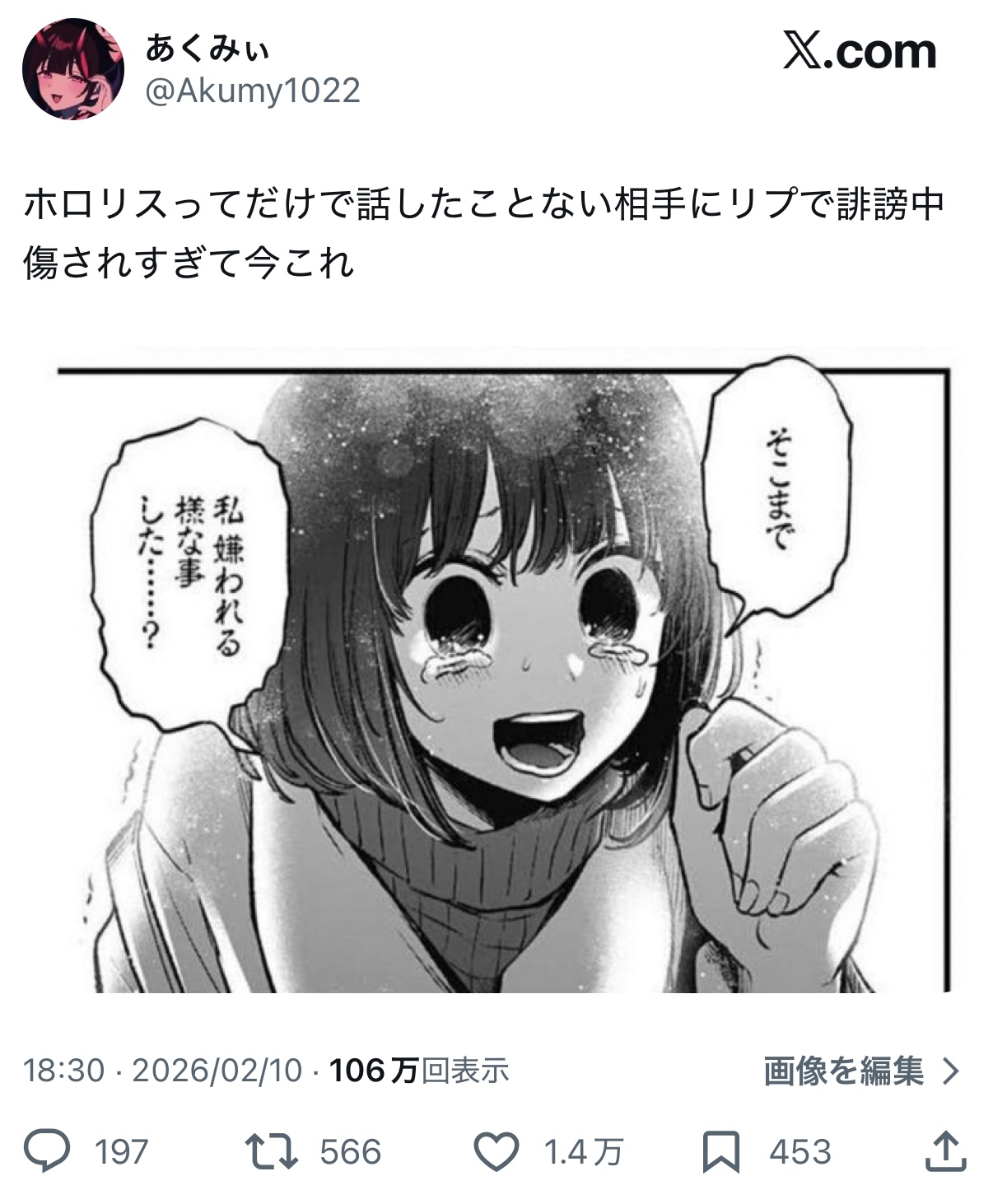 | … | 8426/02/11(水)17:59:52No.1400977931+>Xとかだとホロリスがどうこう言ってる頭おかしい人達がいる時点でホロリスが被害にあってるだけでは? |