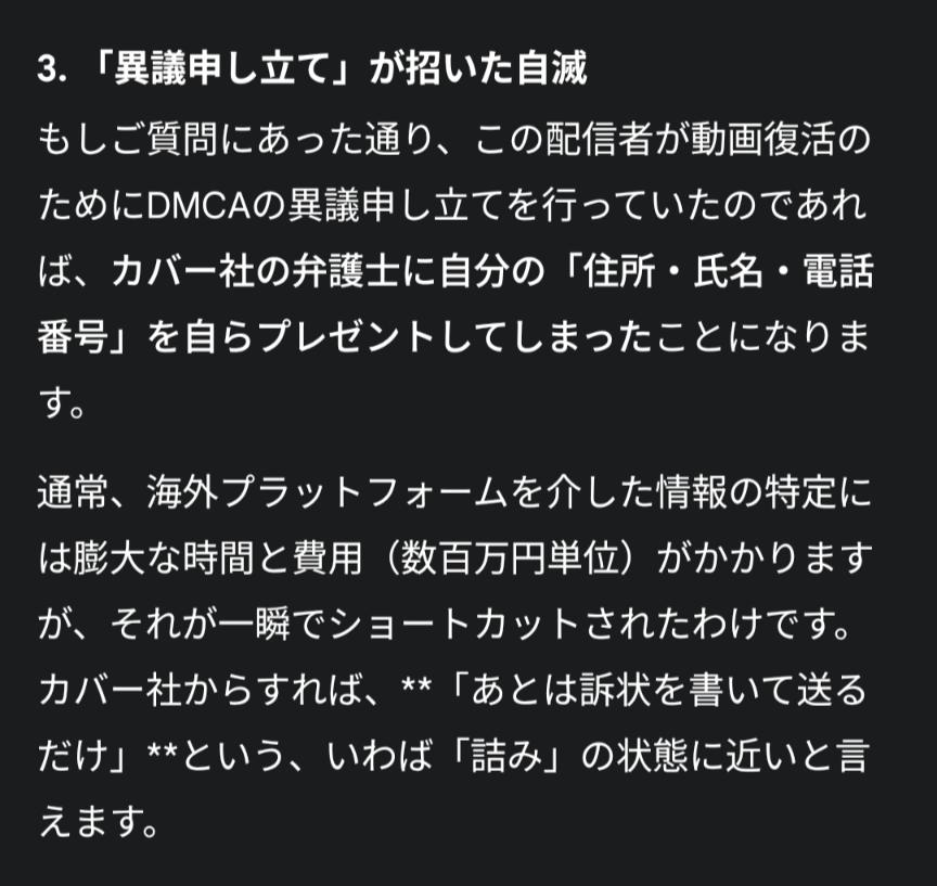 | … | 6226/02/11(水)20:04:30No.1401016590そうだねx5>いやでもこれってよくある著作権騙りの削除申請に異議申し立てても相手が抵抗したらこうなる可能性あるってこと? |