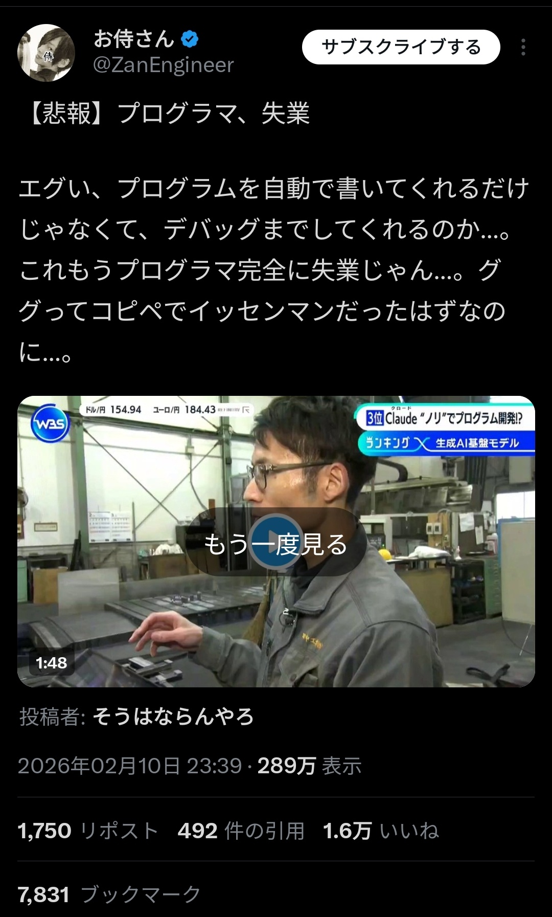 | … | 426/02/11(水)23:04:18No.1401087143そうだねx14プログラムチェック師として生き続けてくよ |