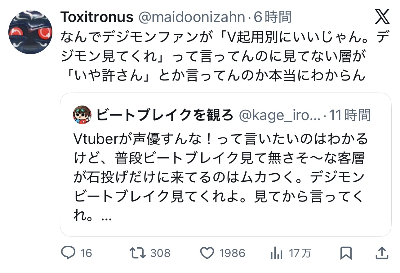 | … | 526/02/12(木)00:08:11No.1401107699+Vが声優しようがしまいがビートブレイクは見ない |