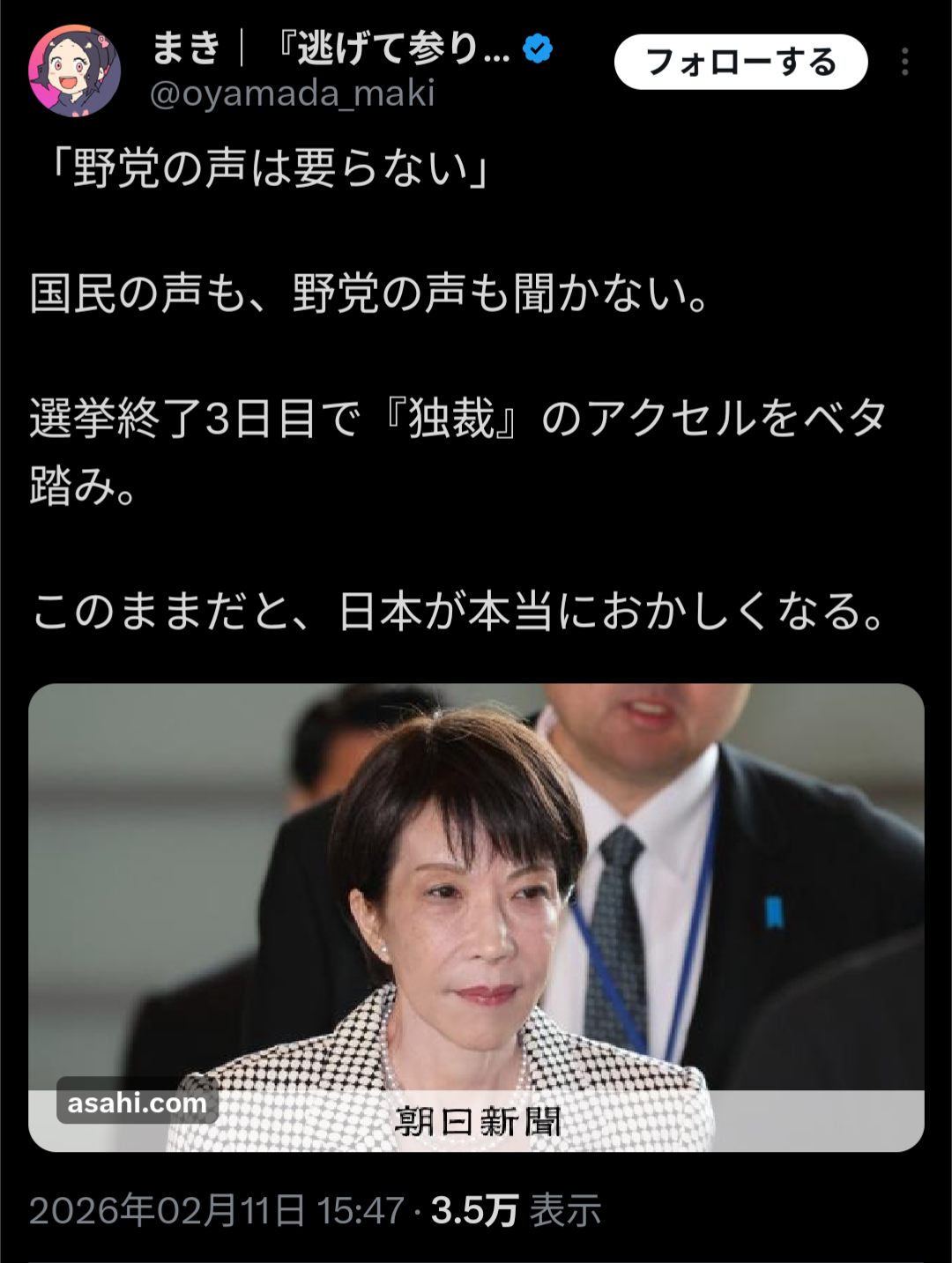 | … | 8026/02/12(木)08:30:04No.1401161574+>>不正とかないのに全然票を取れない野党が悪いだろ |
