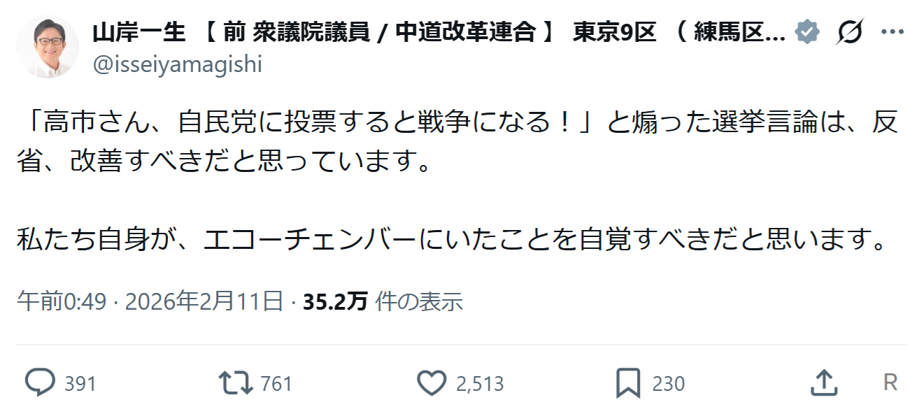 | … | 5326/02/12(木)08:21:54No.1401160401+>前回の選挙なら声が届いてて今回の選挙なら声は届かないってどんなバグなの |
