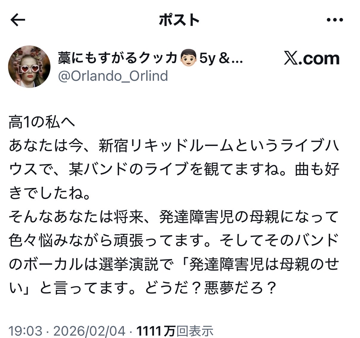 | … | 6026/02/12(木)08:29:27No.1401161494そうだねx6>憧れの人が政治や陰謀論にハマったらファンはどうすればいいの? |