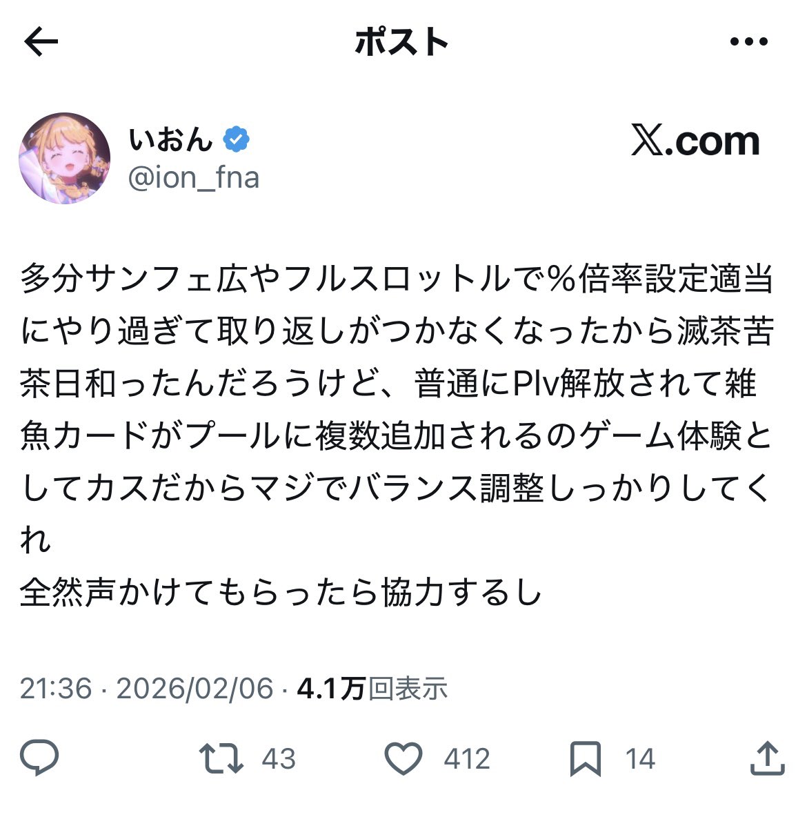 | … | 15626/02/12(木)11:33:39No.1401194488そうだねx3昨日の配信で確かに精神統一には言いすぎたかもしれないけど俺達で声上げてエアプ運営を改善しようぜ!とか言ってたらしくて本当に面白い |