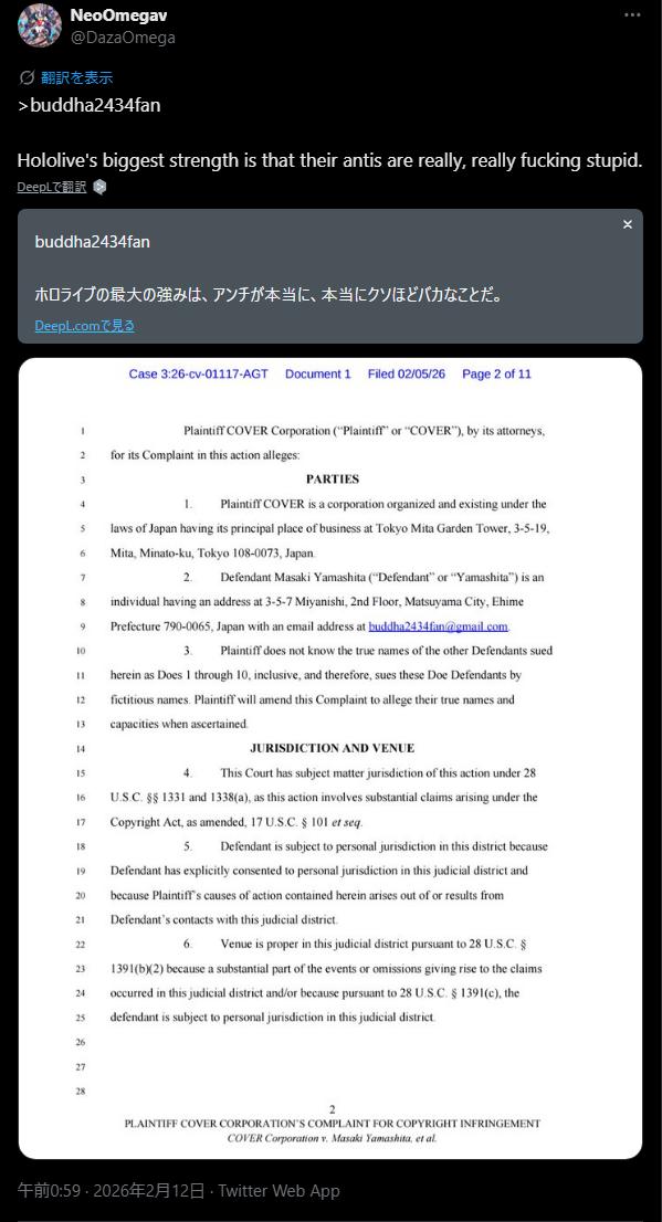 7年ぐらいホロライブ筆頭にVに粘着し続けてたアンチが自爆して名前から住所からメールアドレスまで全部連邦裁判所に公開されたと聞いて見てみたけど面白いねこれ