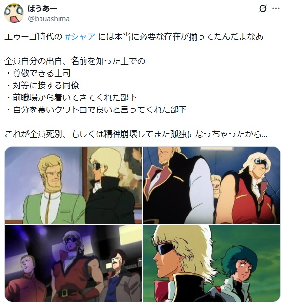 | … | 9526/02/12(木)12:39:58No.1401211868+シャアの話になってカミーユがシャアを貶すとその通りだって嬉しそうな反応するのめんどくせえ男過ぎる… |