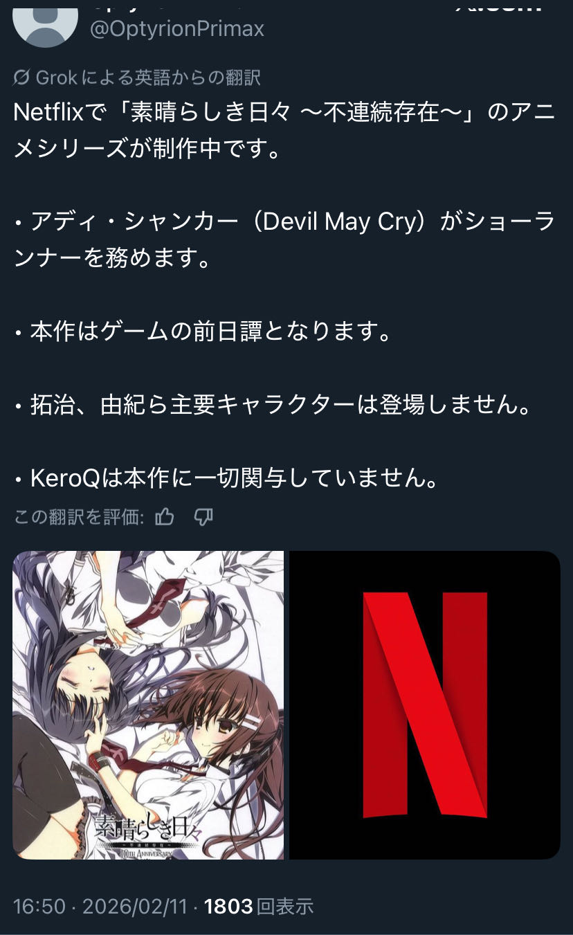 | … | 626/02/12(木)12:38:40No.1401211434+昨日も型月が関与していない月姫前日譚(原作キャラ登場なし)のネトフリアニメのリークスレ立ってたな… |