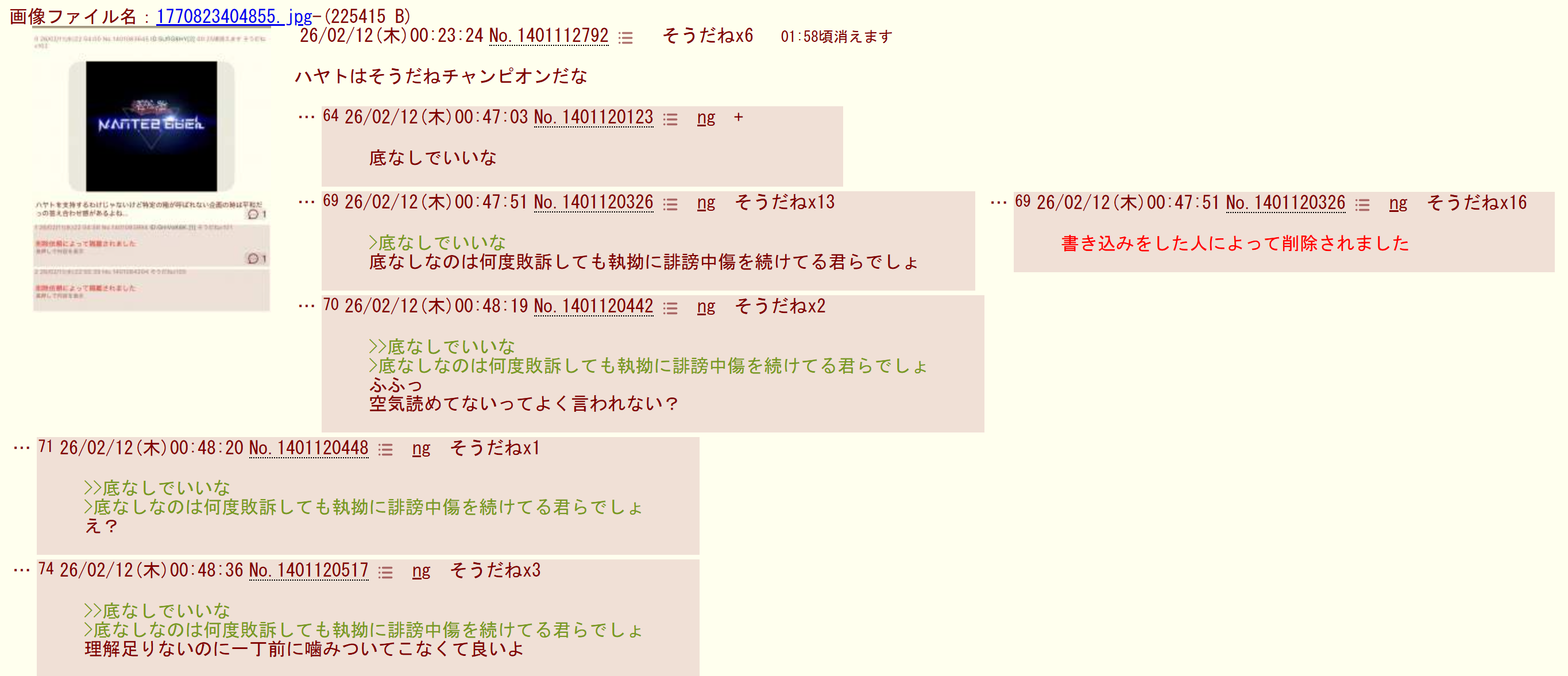 | … | 226/02/12(木)22:00:05 ID:nzJYPUlMNo.1401377093そうだねx17削除依頼によって隔離されました |