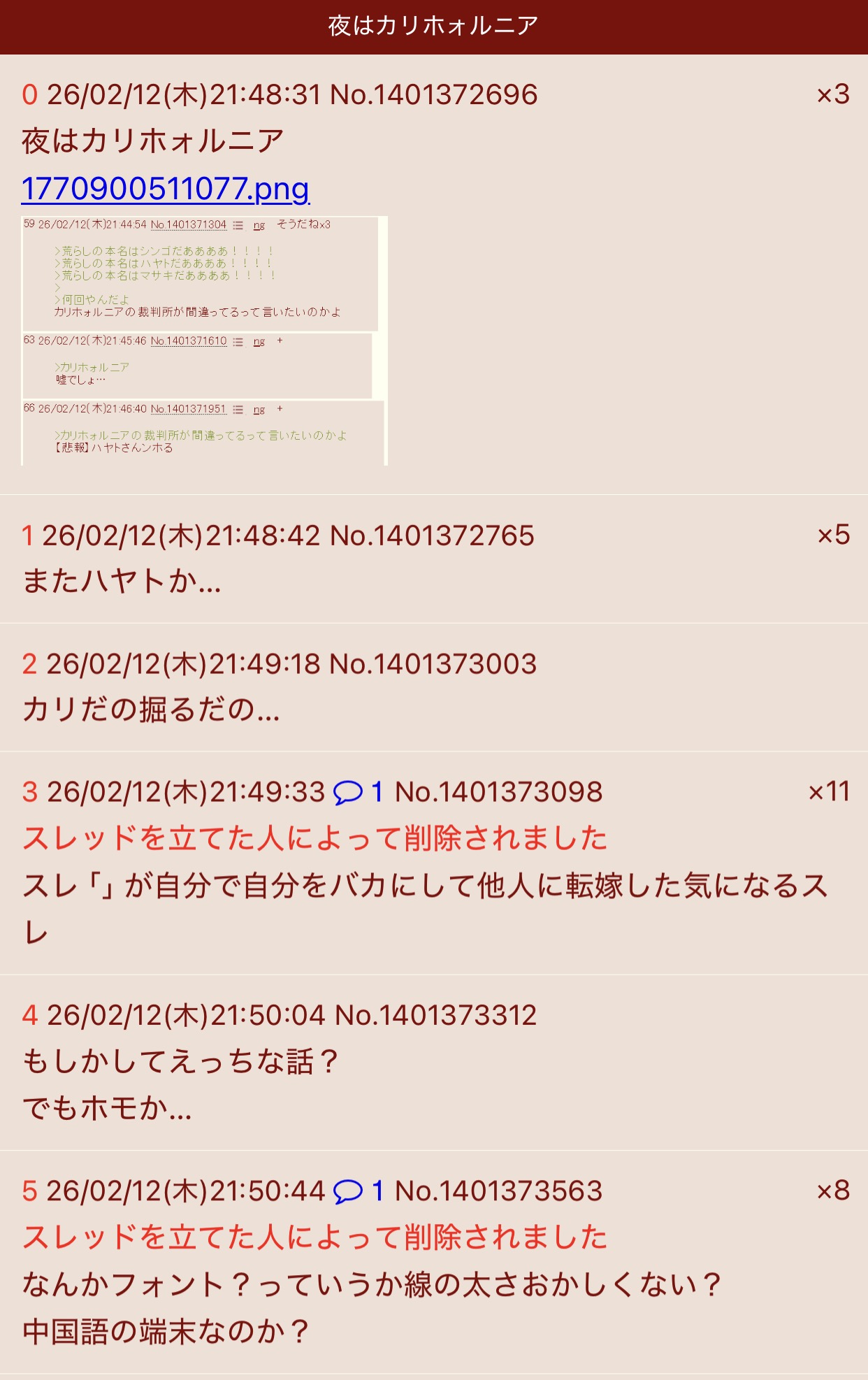 | … | 5426/02/12(木)22:15:14No.1401382785+書き込みをした人によって削除されました |