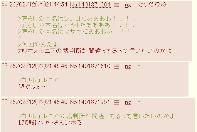 | … | 626/02/12(木)22:01:04No.1401377483そうだねx7マサキのために中国でハヤト訴えればいいじゃん |