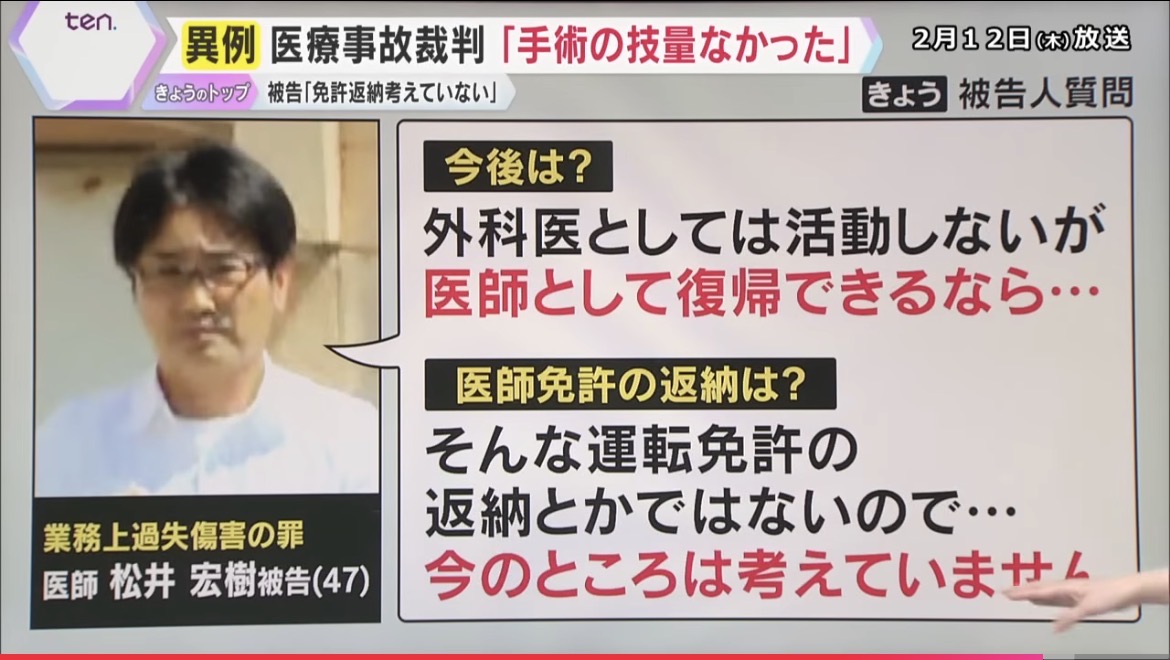 | … | 126/02/13(金)00:44:27No.1401433791そうだねx9松井被告は終始、姿勢よく、はきはきとした口調で受け答えする一方で、廷内で手術の映像が証拠として上映された際、許可なく話し始め、弁護士に制止される場面などもありました。 |