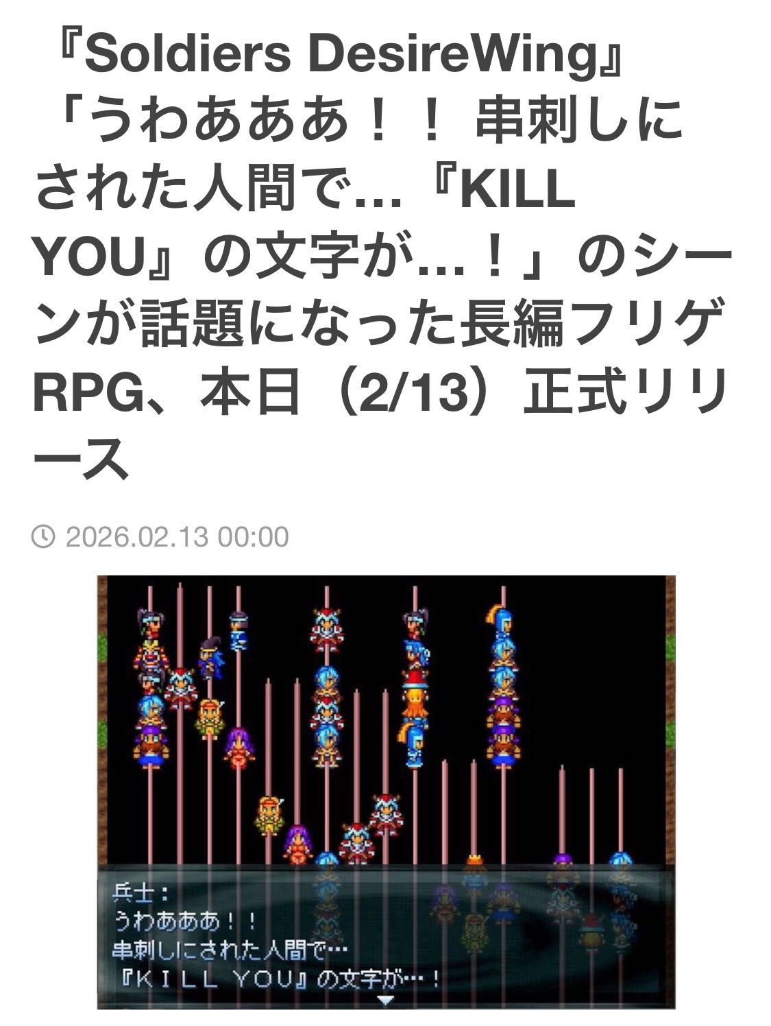| … | 1126/02/13(金)00:53:48No.1401436274そうだねx31>うわあああ!串刺しにされた人間で…thank you for playingの文字が…! |