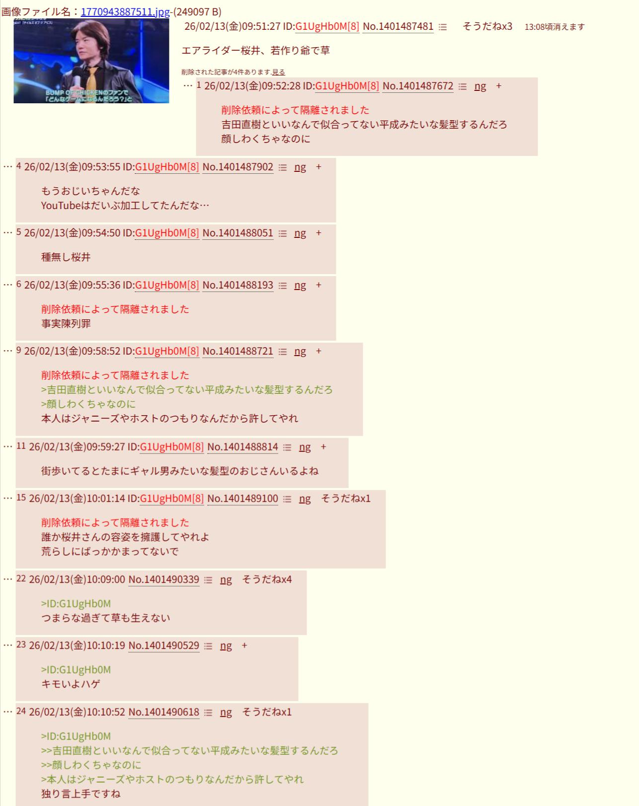 | … | 2026/02/13(金)10:06:19No.1401489906そうだねx3障害者、誹謗中傷してて草 |