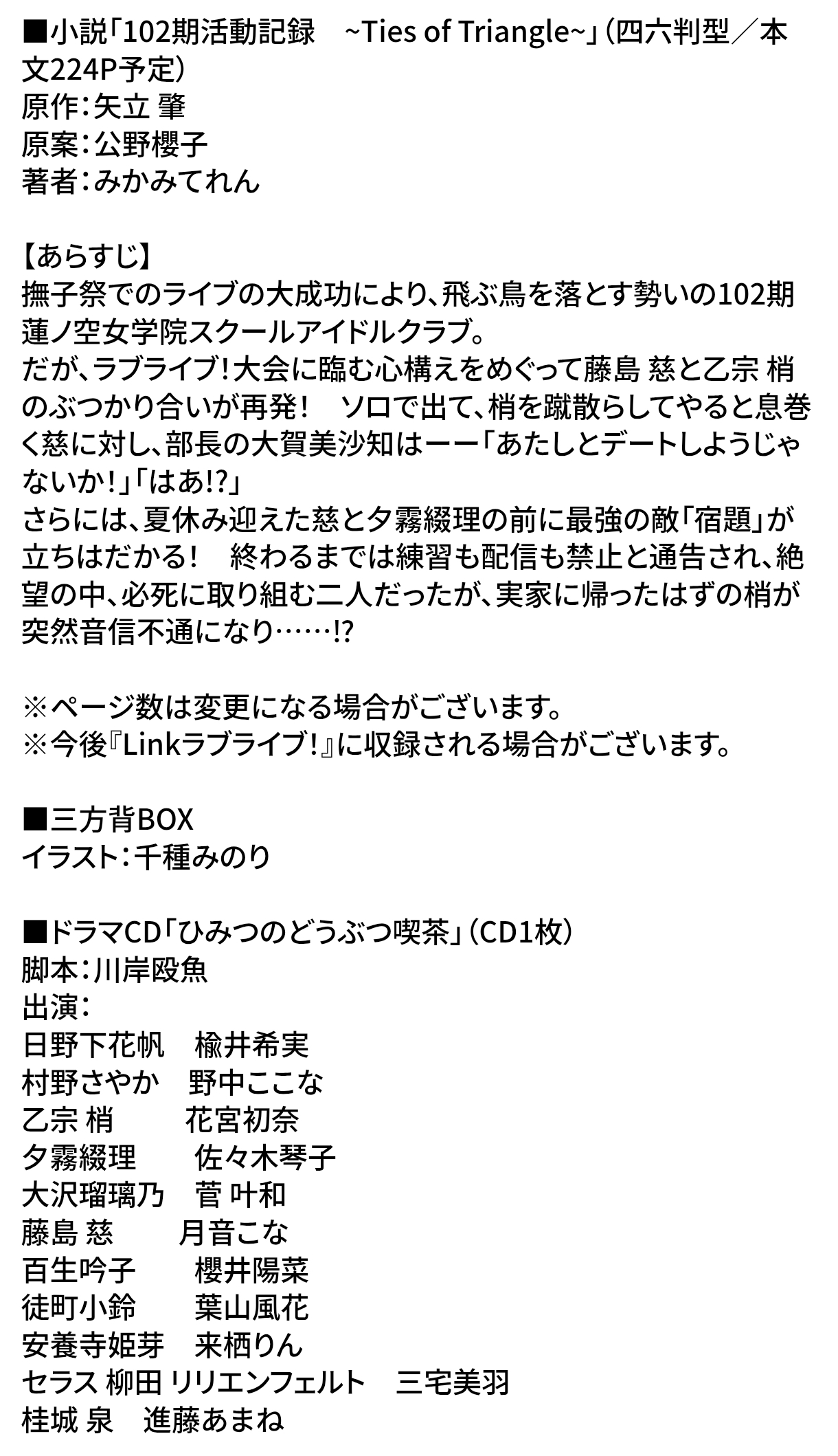 | … | 10526/02/13(金)13:00:50No.1401531292+ドラマCDは、104期竜胆祭で営業していたという102期生によるどうぶつ喫茶の秘話が105期生のセラス 柳田 リリエンフェルトの口から語られる「ひみつのどうぶつ喫茶」を収録しています。 |