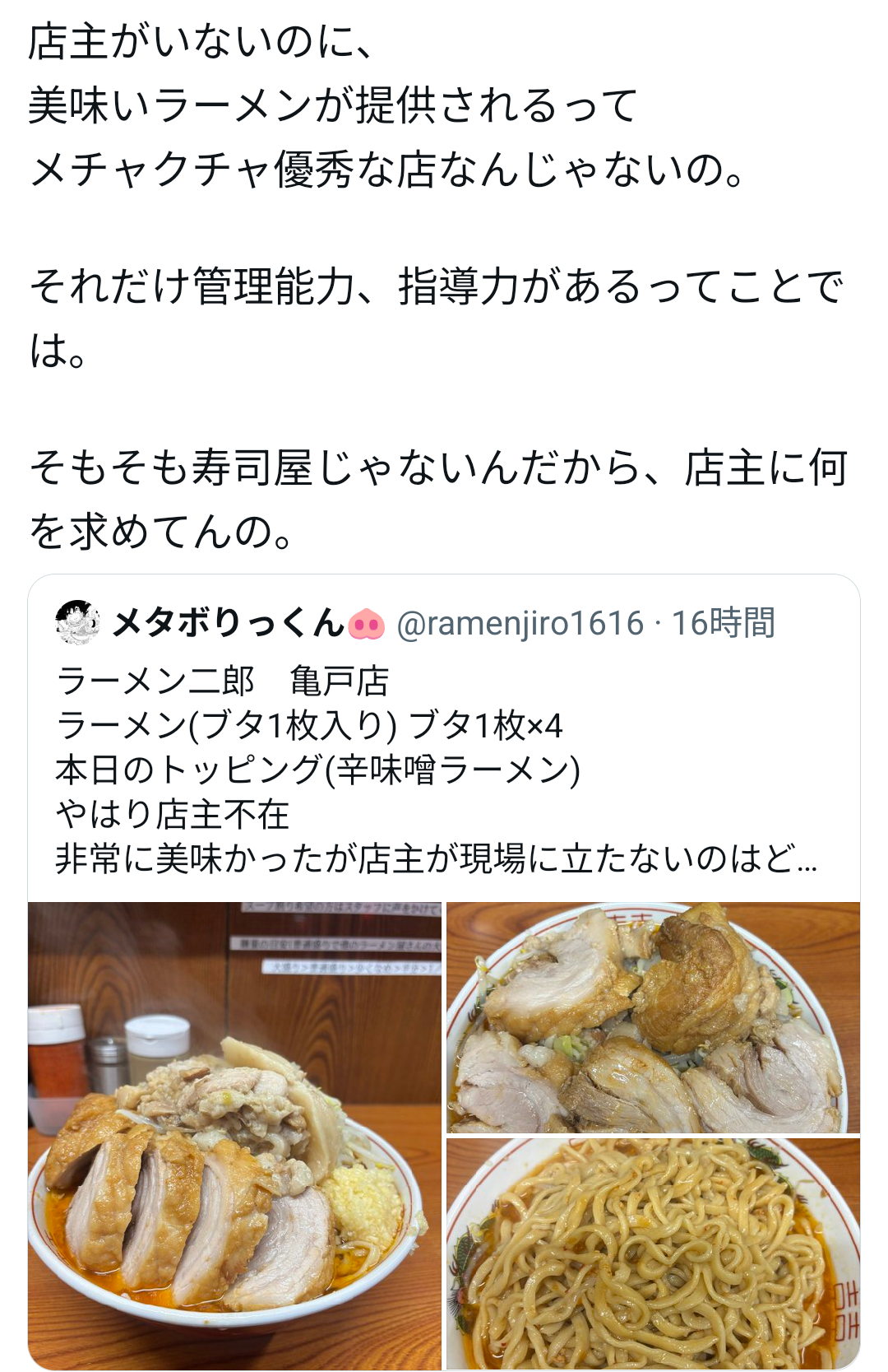 | … | 1226/02/13(金)10:40:28No.1401494911そうだねx2>店主が厨房に立つのは二郎ののれん分け条件 |