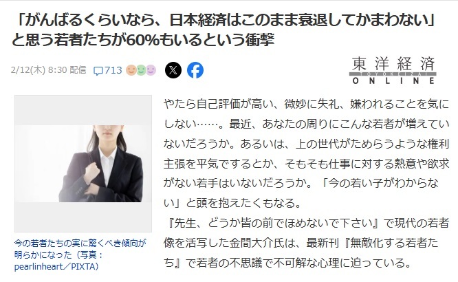 | … | 12026/02/13(金)15:26:40No.1401570284そうだねx1こんな記事バンバン出して年寄りが日本の未来は暗い!なんてやってんだから若者が未来に希望を持つわけがなく |