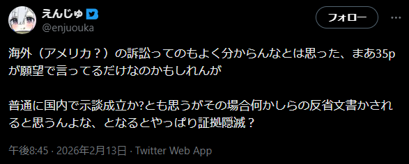 | … | 2026/02/13(金)21:15:32 ID:4GkhAcsgNo.1401677693+>>なんでアメリカで裁判するんだ |