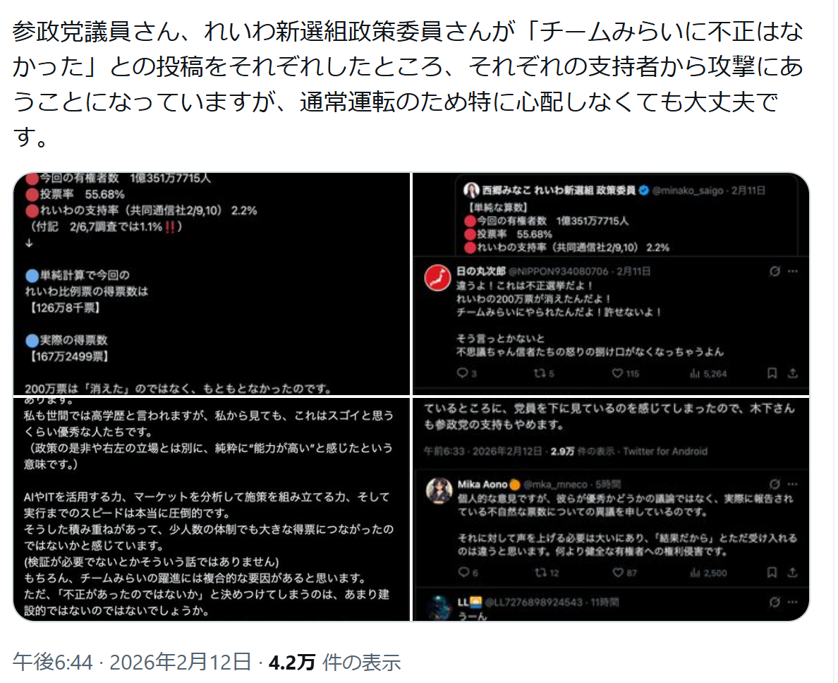 | … | 1926/02/13(金)22:51:36No.1401718153+でもれいわと参政みたいな下からの怨念を伝える政党は必要だよな |