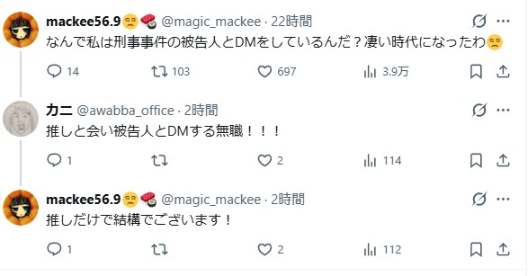 | … | 3626/02/13(金)22:03:34No.1401699876+裁判の傍聴者にまでDM突撃してるらしくてコイツ無敵か? |