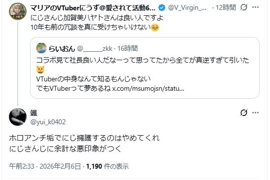 | … | 526/02/13(金)21:49:31 ID:JylmLPzINo.1401694036そうだねx12ホロアンチ垢でにじ擁護するな |