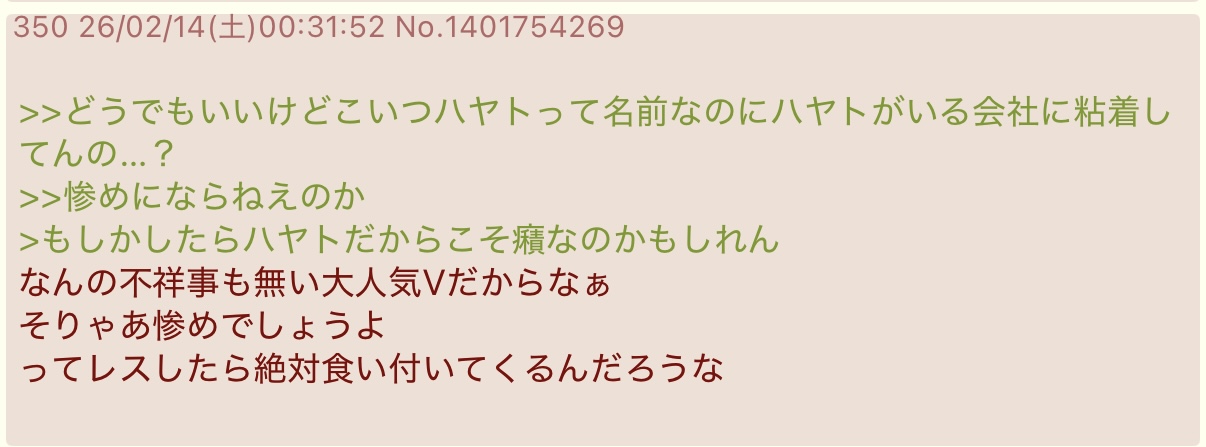 | … | 59526/02/14(土)03:26:17No.1401782507そうだねx1もしかしてハヤトって名前だからVtuberに嫉妬してるの!? |