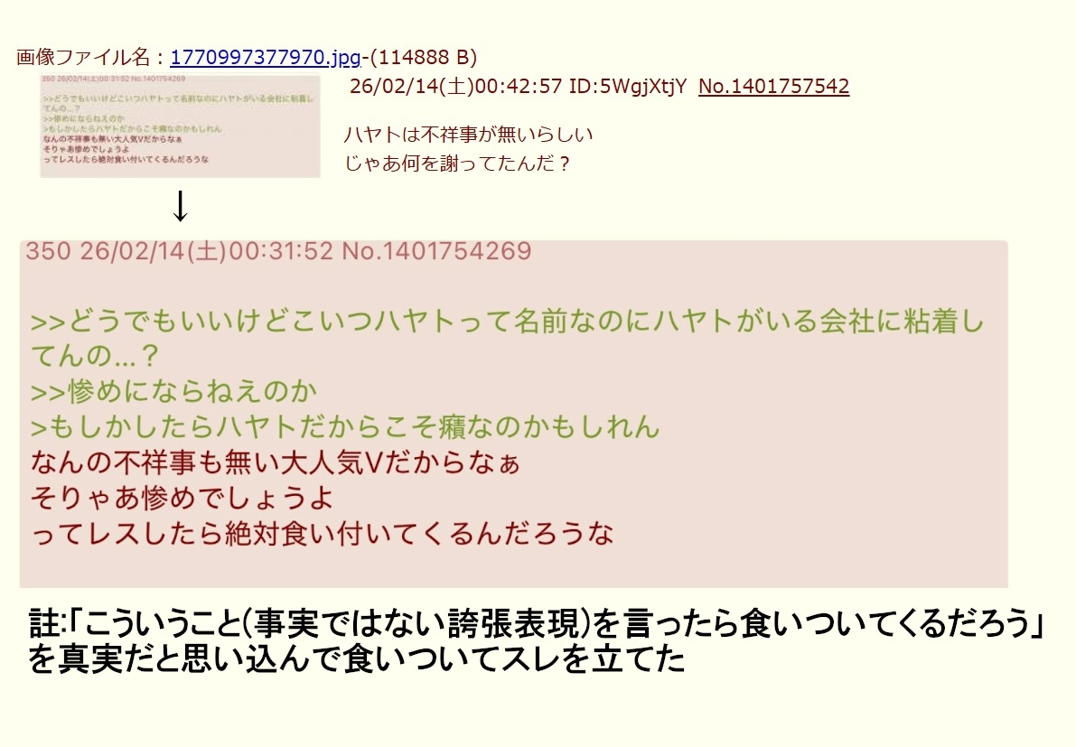 | … | 54126/02/14(土)02:48:26No.1401779919そうだねx2>うんうんもうハヤト認定と執拗な誤字弄りしか手札が無いんだね |