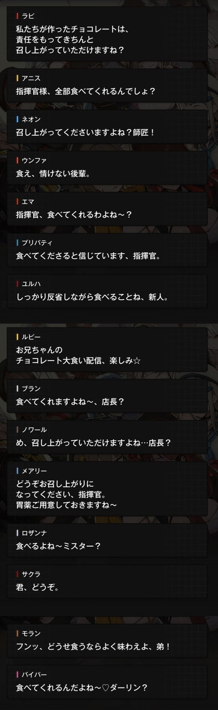 | … | 8126/02/14(土)01:23:28No.1401767998+今回のバレンタインはラピだけレッフー継いでるからアニスとネオンが離れる前ってことで良いんか…? |
