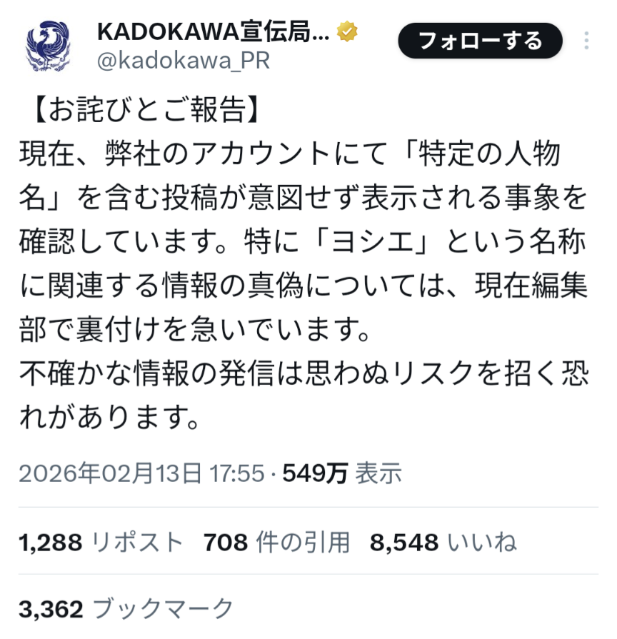 | … | 11026/02/14(土)07:40:08No.1401797969+現在編集部で裏付けしてますのとこはマジの謝罪ならこんな書き方するかな…?とはなる |