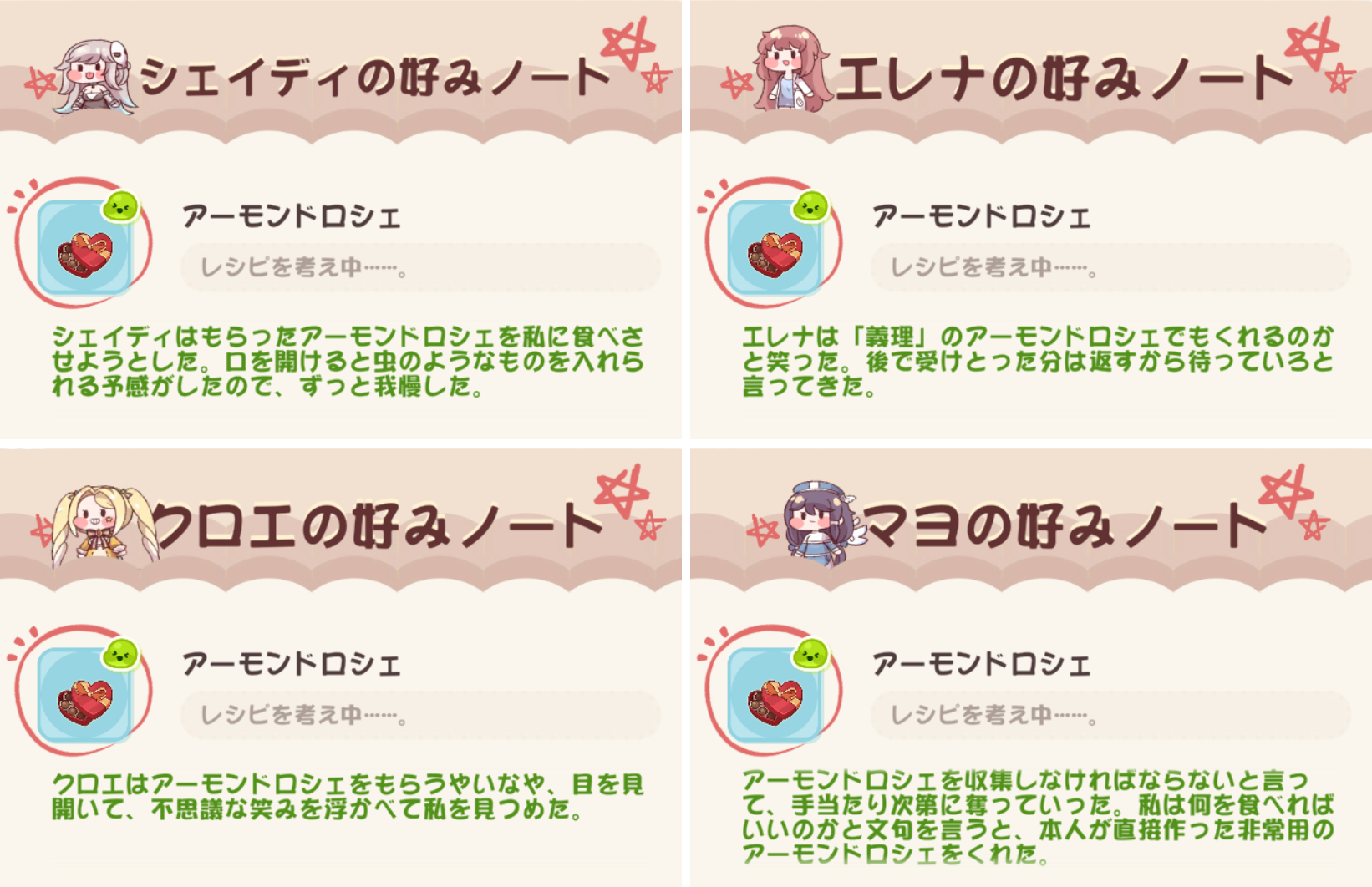 | … | 48826/02/14(土)09:42:55 ID:ZtAtSKb.No.1401816701そうだねx1>クロエしか未所持がいないから100日イベの時にくれたのとポイント貯めてもらったエルダインチケが倉庫に眠ってるにゃん |