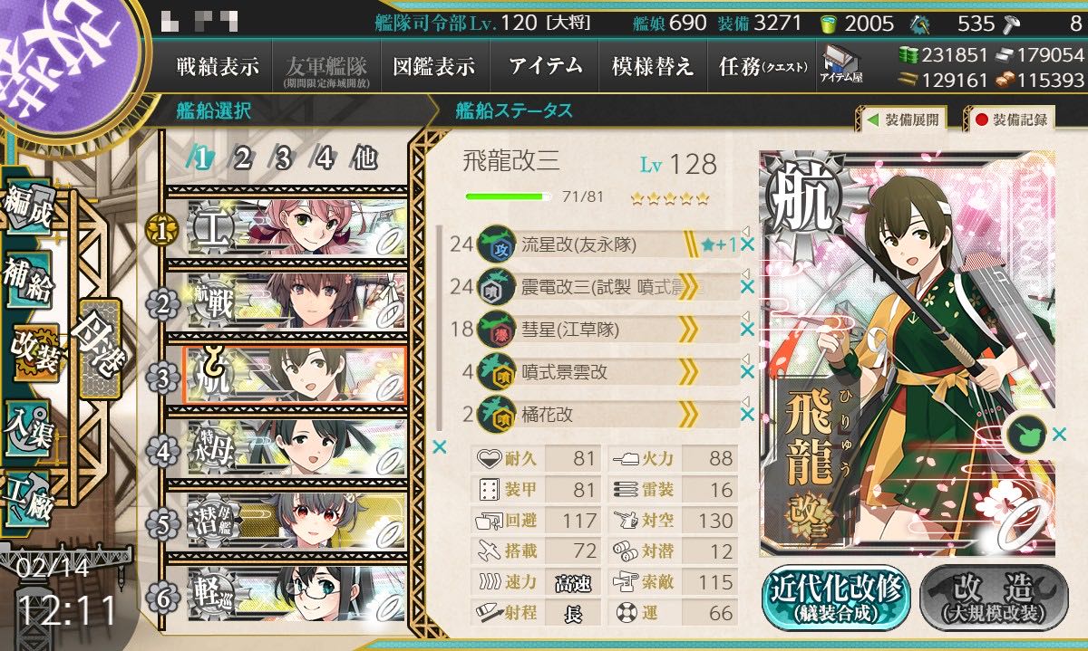 | … | 9526/02/14(土)12:16:39No.1401852819そうだねx1飛龍改三のスロット数が独特すぎて4-5高速+編成以外で活用出来る気がしないデース |