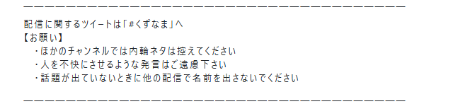・私に関連する話題の中で、他のライバーや活動者の方を攻撃したり、誹謗中傷したりする言動は厳にお控えください。