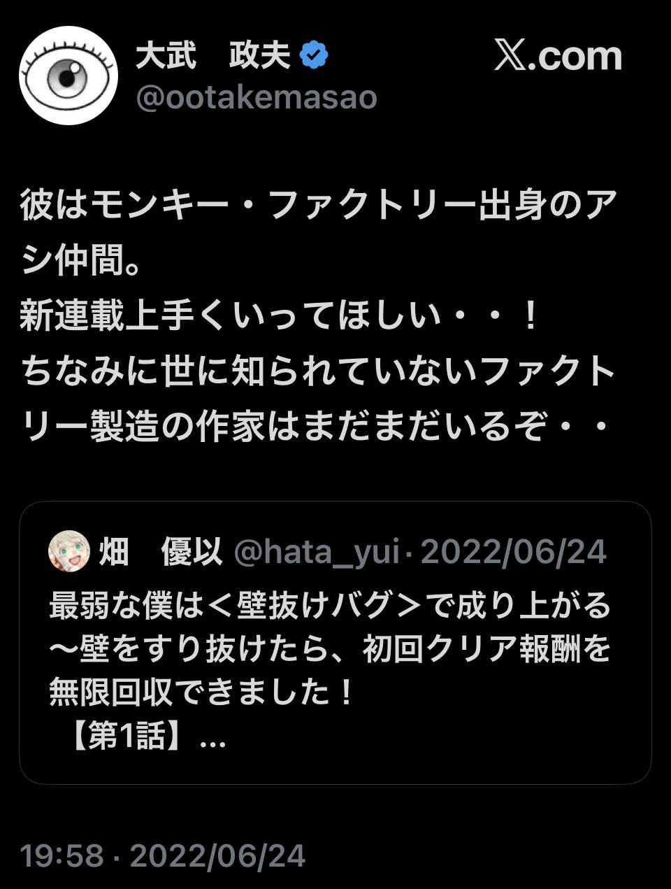 | … | 5326/02/14(土)14:38:06No.1401892539そうだねx3>壁抜けバグのコミカライズもモンファク出身じゃなかったっけ |