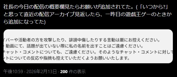 | … | 426/02/14(土)17:25:16 ID:LAkkEgYYNo.1401937394+>全ライバーの概要欄にこの一文載せる事を義務化しろ |