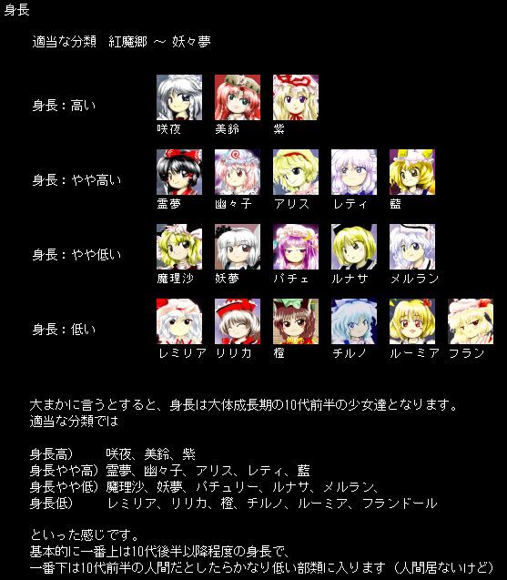 | … | 15926/02/14(土)18:52:46No.1401968243+>東方キャラは胸のサイズより身長設定でビビる事がある |