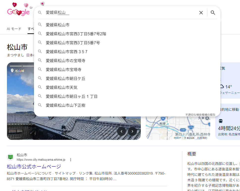 愛媛県松山市って入れるとなんか特定の住所出るようになってて笑ったこのスレは古いので、もうすぐ消えます。