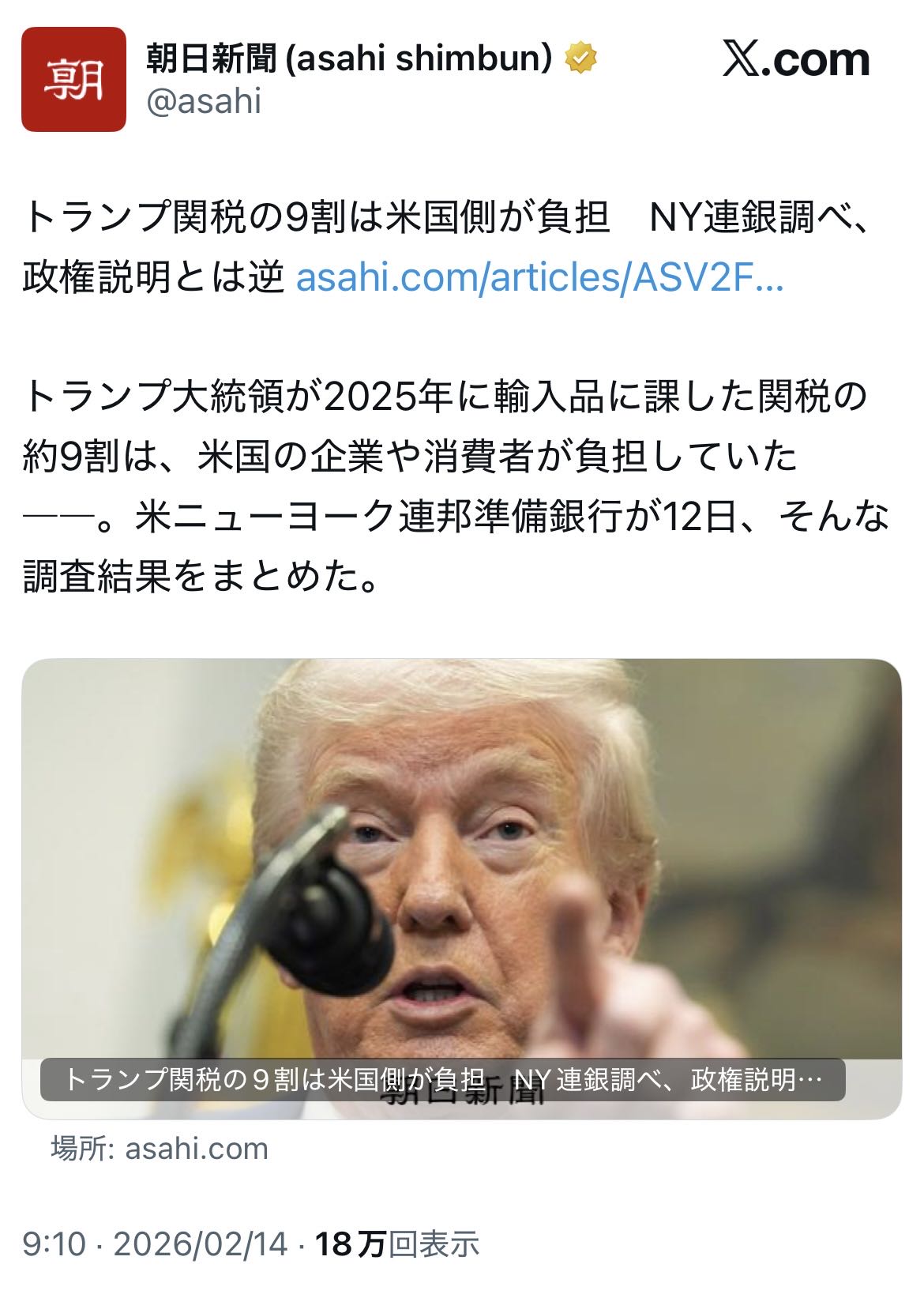 | … | 526/02/15(日)11:18:59No.1402218881そうだねx46そりゃ関税って輸入側が払うもんだしアメリカの企業や個人が払うのは当たり前では? |