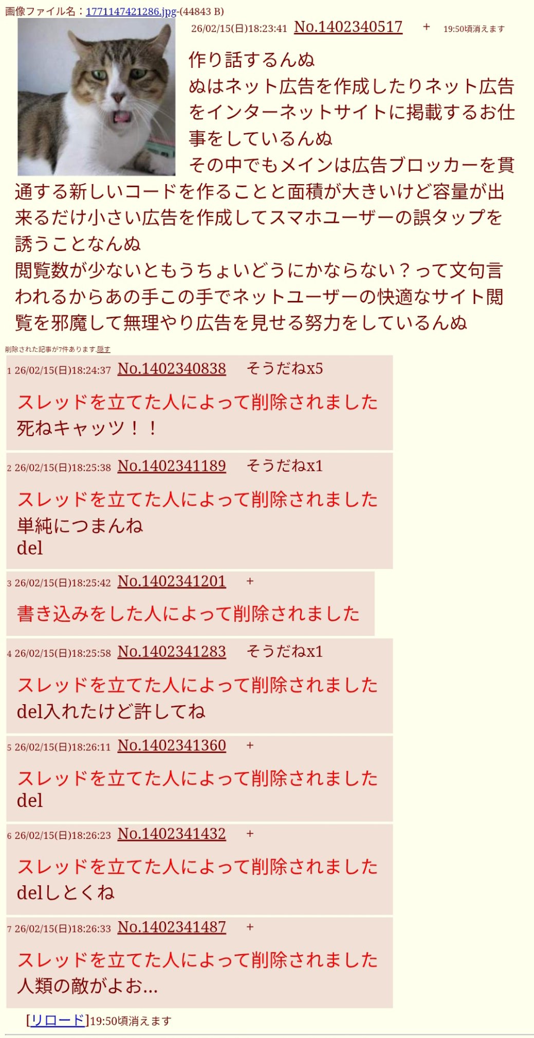| … | 526/02/15(日)18:34:38No.1402344154そうだねx6>荒らししか来ねえスレなんて自分の手で消したほうがいいだろ |
