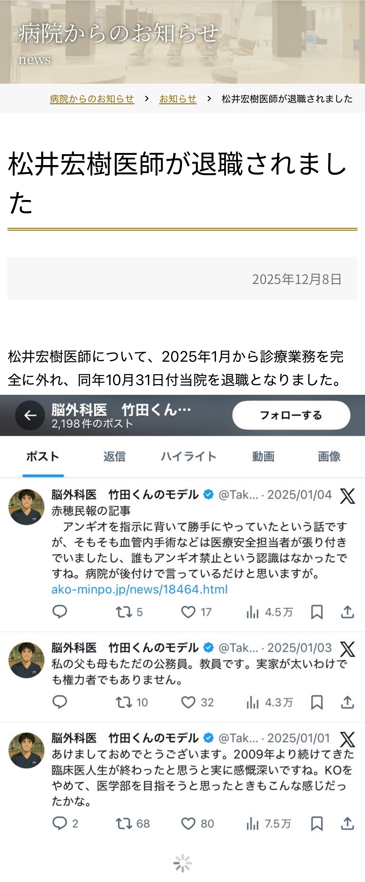 | … | 46226/02/15(日)20:25:44No.1402383721+隠蔽した院長は逃げ切って余裕の老後だからそりゃ他も隠蔽だらけよな |